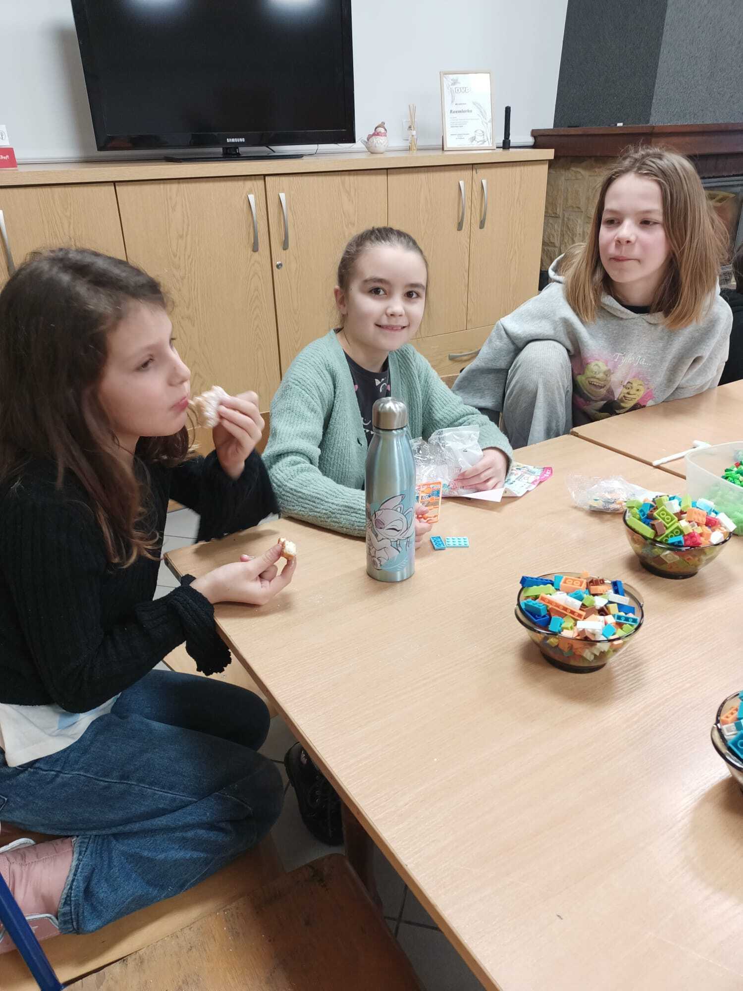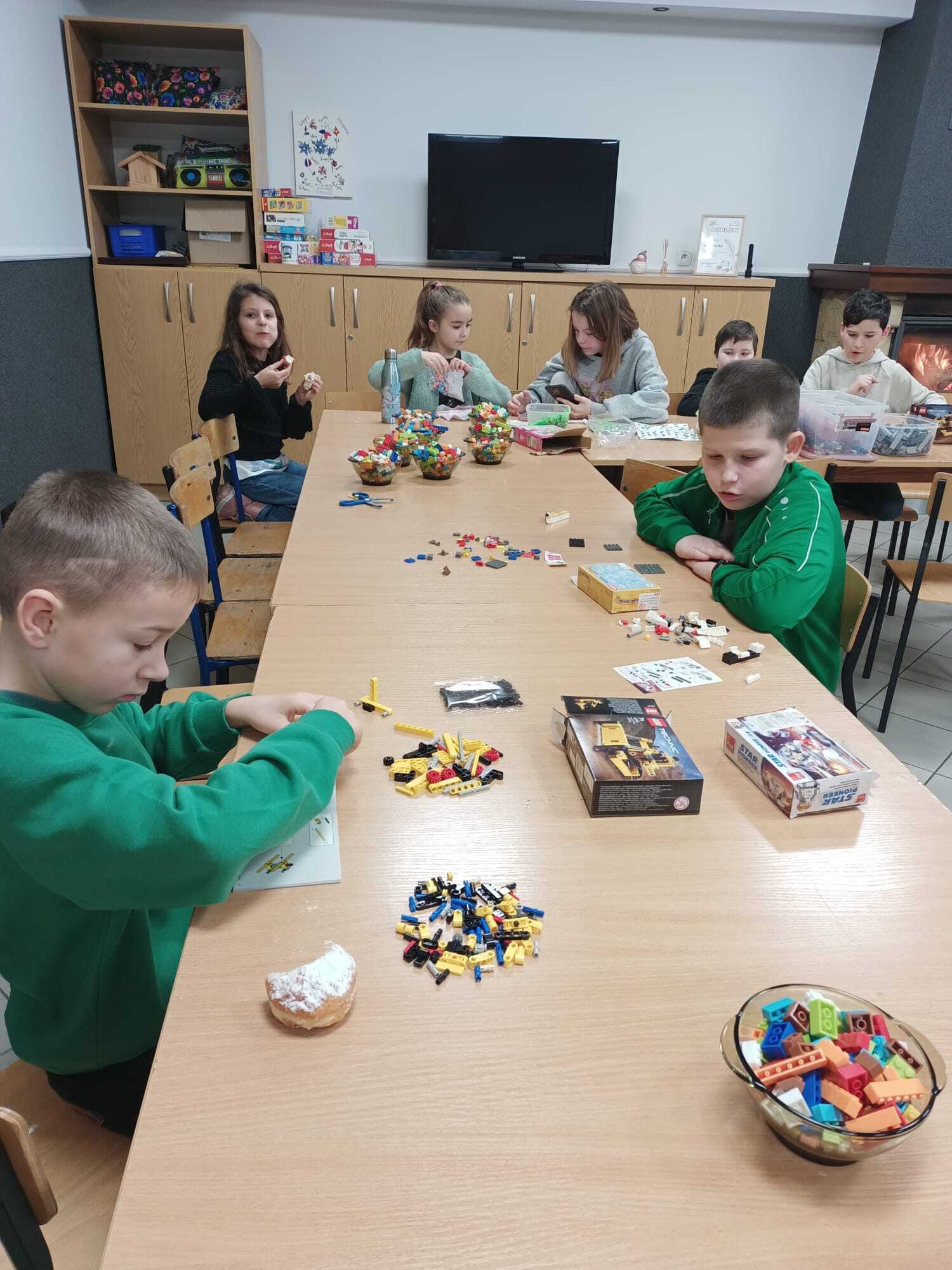 Czwartek to dzień układania klocków LEGO - nasza świetlica zamieniła się w pracownię techniczną. Każdy uczestnik mógł pobudzić swoją wyobraźnię i tworzyć własne konstrukcje od podstaw. Układanie klocków także pobudza kreatywność i wyobraźnię oraz uczy cierpliwości i eksperymentowania. Każda stworzona konstrukcja dawała wiele satysfakcji ich twórcom. Tego dnia obchodziliśmy Tłusty czwartek i nawet u nas nie zabrakło pysznych pączków, które znikły w oka mgnieniu.